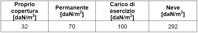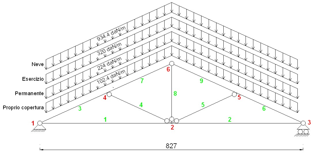 Nella figura, i numeri in rosso indicano i nodi, mentre quelli in verde le aste. I carichi riportati nell'immagine precedente si riferiscono ad uno sviluppo di 3.2 m ortogonale alla stessa capriata. I carichi per metro quadro di copertura sono riportati nella tabella successiva.