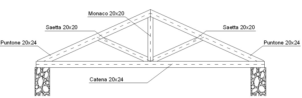 Nella figura seguente si evidenziano le dimensioni scelte per gli elementi di cui è costituita la capriata. Si scelgono elementi in legno lamellare (materiale GL24h) con sezione 20x24 per la catena ed i puntoni, mentre per monaco e saette si scelgono sezioni 20x20.