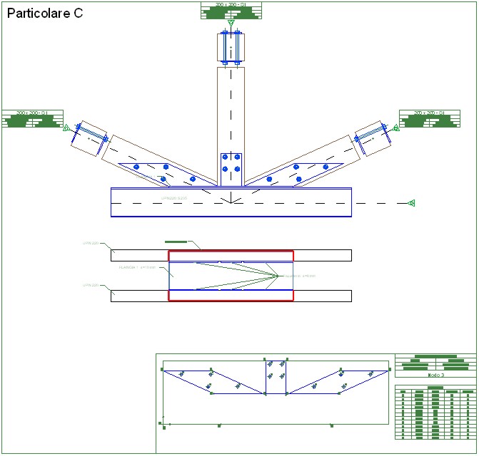 Sui due profili UPN 220 (catena della capriata e traverso superiore del telaio in acciaio) viene saldata una piastra metallica sulla quale a sua volta vengono saldate sei piastre le quali vengono collegate al monaco ed alle saette della capriata attraverso bullonatura.
