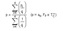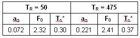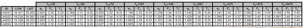 Calcolate le distanze tra i punti della maglia e la struttura, attraverso la seguente relazione (riportata in Appendice A delle NTC), è possibile determinare ag, F0 e T*c del sito che sono riportate nella tabella successiva.
