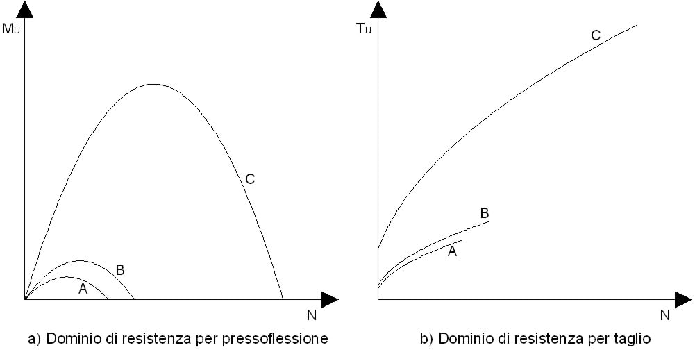 Figura 8.7.4 - Dominio a pressoflessione (a) e taglio (b) per il maschio murario con e senza cuci-scuci