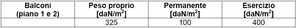 Analogamente ai solai, i balconi sono di tipo latero-cementizi gettati in opera aventi le stesse caratteristiche dei solai. Nella tabella 10 vengono riassunti i suddetti carichi: